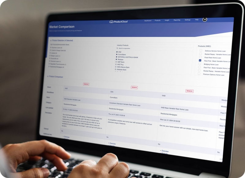 ProductCloud is an end-to-end solution for financial service product teams to view, manage, and publish their financial products. All with the benefits of seamless third-party integration and unrivalled market insights.